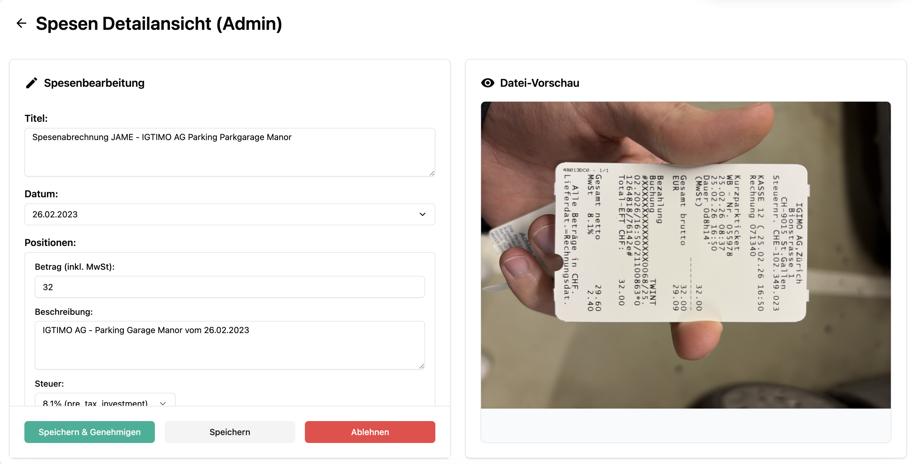 Mitarbeitende machen ein Foto, hochladen – fertig. Betrag und MwSt werden automatisch erkannt, kein manuelles Eintippen nötig.
